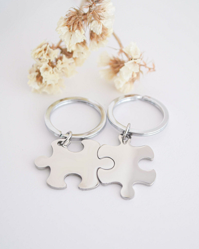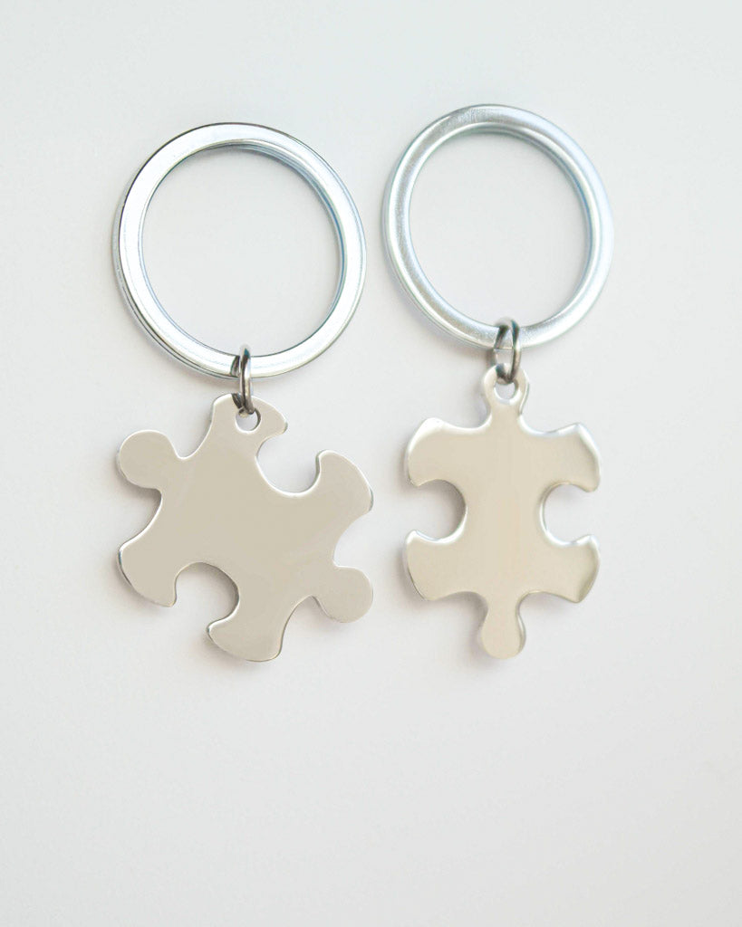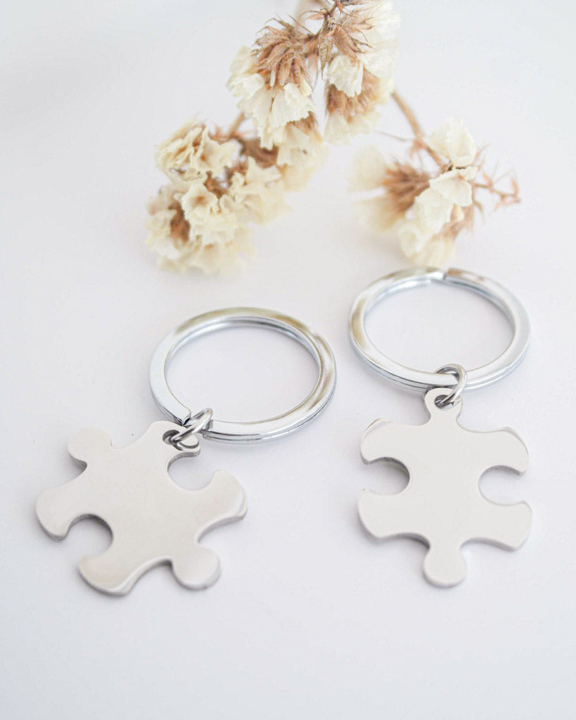 Dois porta-chaves que se encaixam como peças de um puzzle, simbolizando a beleza de duas individualidades que se completam. Uma lembrança atemporal para celebrar laços que inspiram e permanecem.